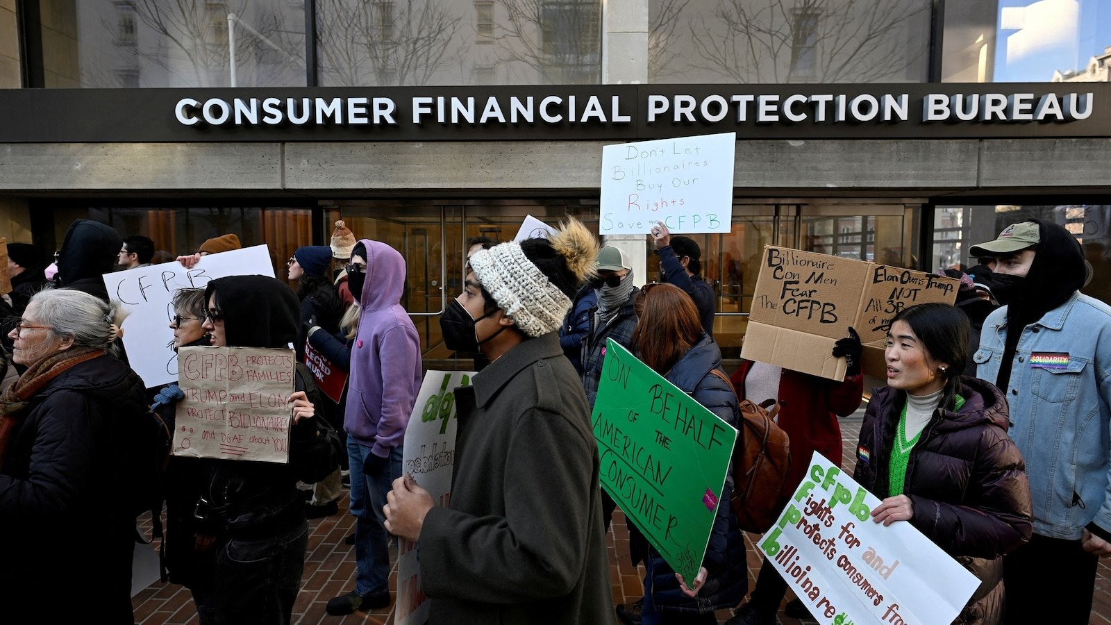 Supporters of the Consumer Financial Protection Bureau rally after acting CFPB Director Russell Vought told all of the agency’s staff to stay away from the office and do no work, outside the CFPB in Washington, D.C., Feb. 10, 2025.