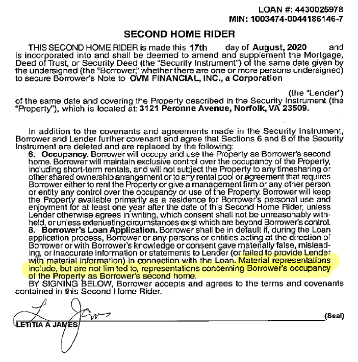 This language eliminates ambiguity. It doesn’t matter whether a jury thinks occupancy rules are unclear or whether the lender actually verified usage. It doesn’t matter if the jury thinks what Letitia James said about the occupancy is important or not. The borrower agreed in this contract that occupancy representations are material.