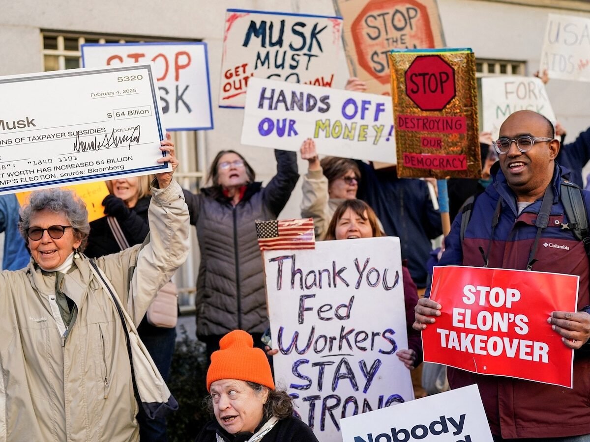 Demonstrators rally outside the U.S. Treasury Department after it was reported billionaire Elon Musk, who is heading U.S. President Donald Trump’s drive to shrink the federal government, has gained access to Treasury’s federal payments system that sends out more than $6 trillion per year in payments on behalf of federal agencies and contains the personal information of millions of Americans, in Washington, Feb. 4, 2025.