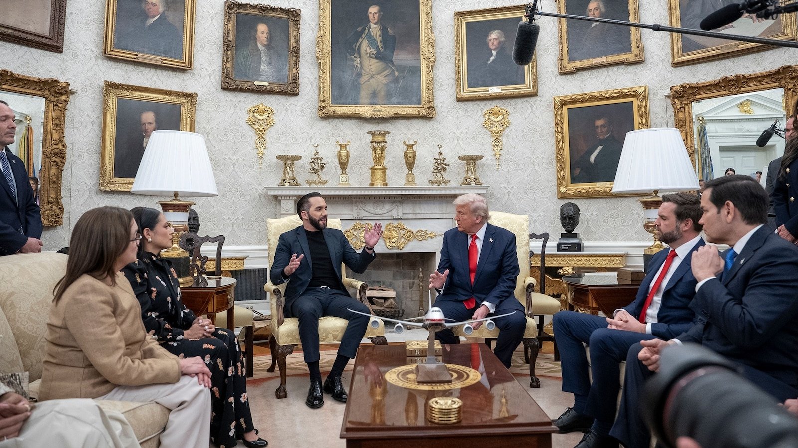 President Donald Trump meets with El Salvador President Nayib Bukele in the Oval Office at the White House in Washington, April 14, 2025.