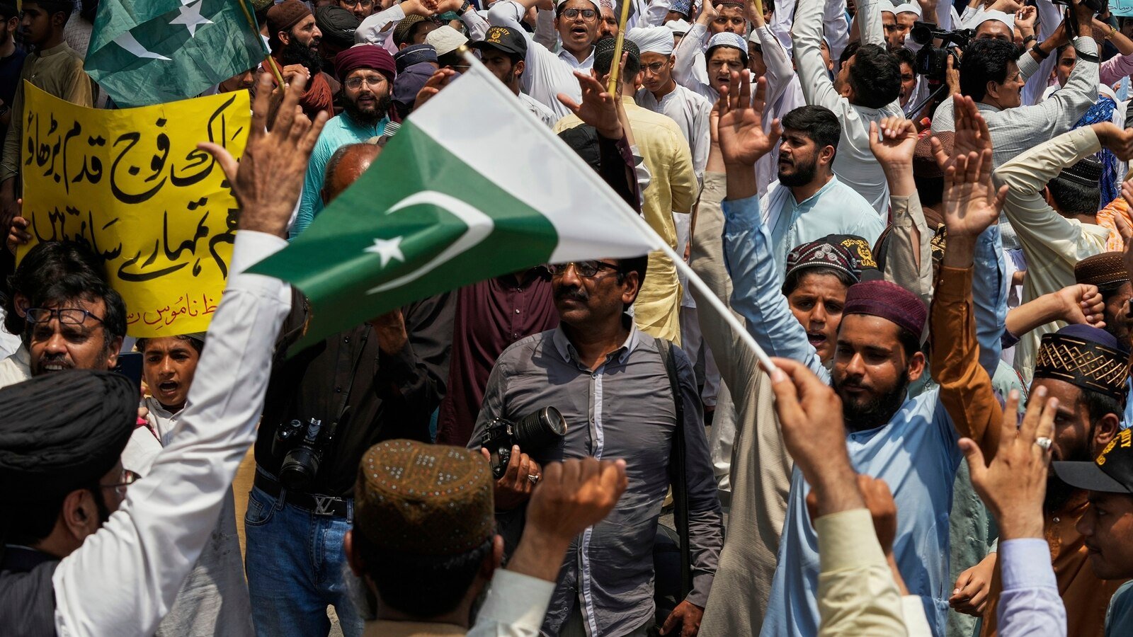 Supporters of a religious group ‘Tahafuz-e-Namoos-e-Risalat Mahaz’ take part in a rally to condemn Indian strikes in Pakistan and to show their support with Pakistan Army, in Lahore, Pakistan, Saturday, May 10, 2025.