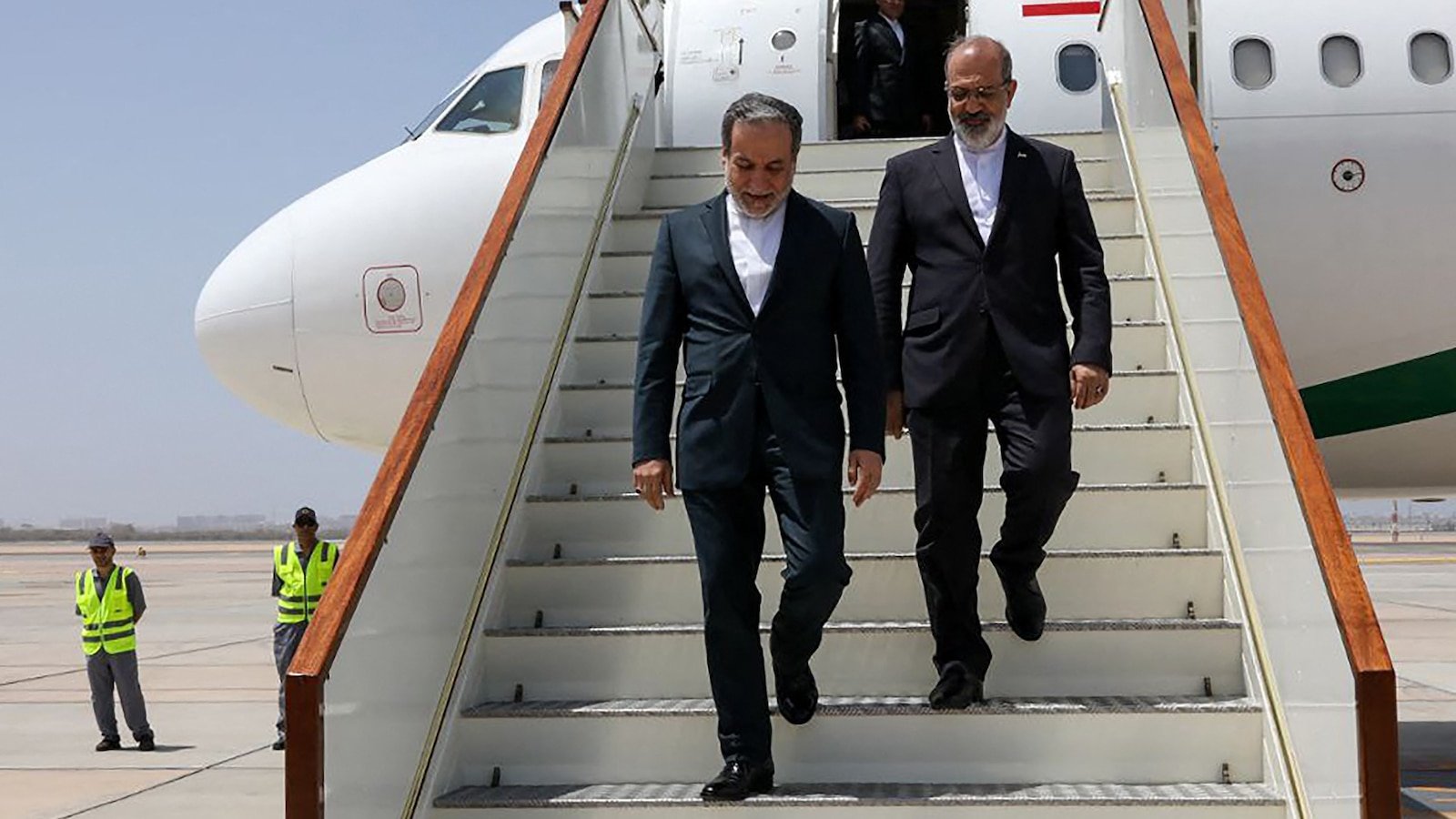 This handout picture provided by the Iranian Foreign Ministry on May 11, 2025, shows Iran’s Foreign Minister Abbas Araghchi (L) descending the stairs of an aircraft upon his arrival in Muscat.