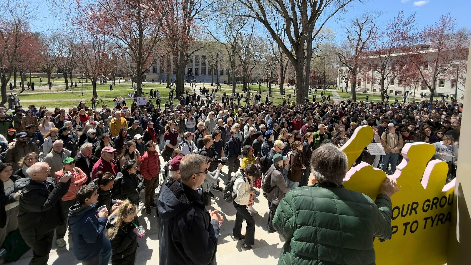 Students, faculty and members of the Harvard University community rally, April 17, 2025, in Cambridge, Mass.