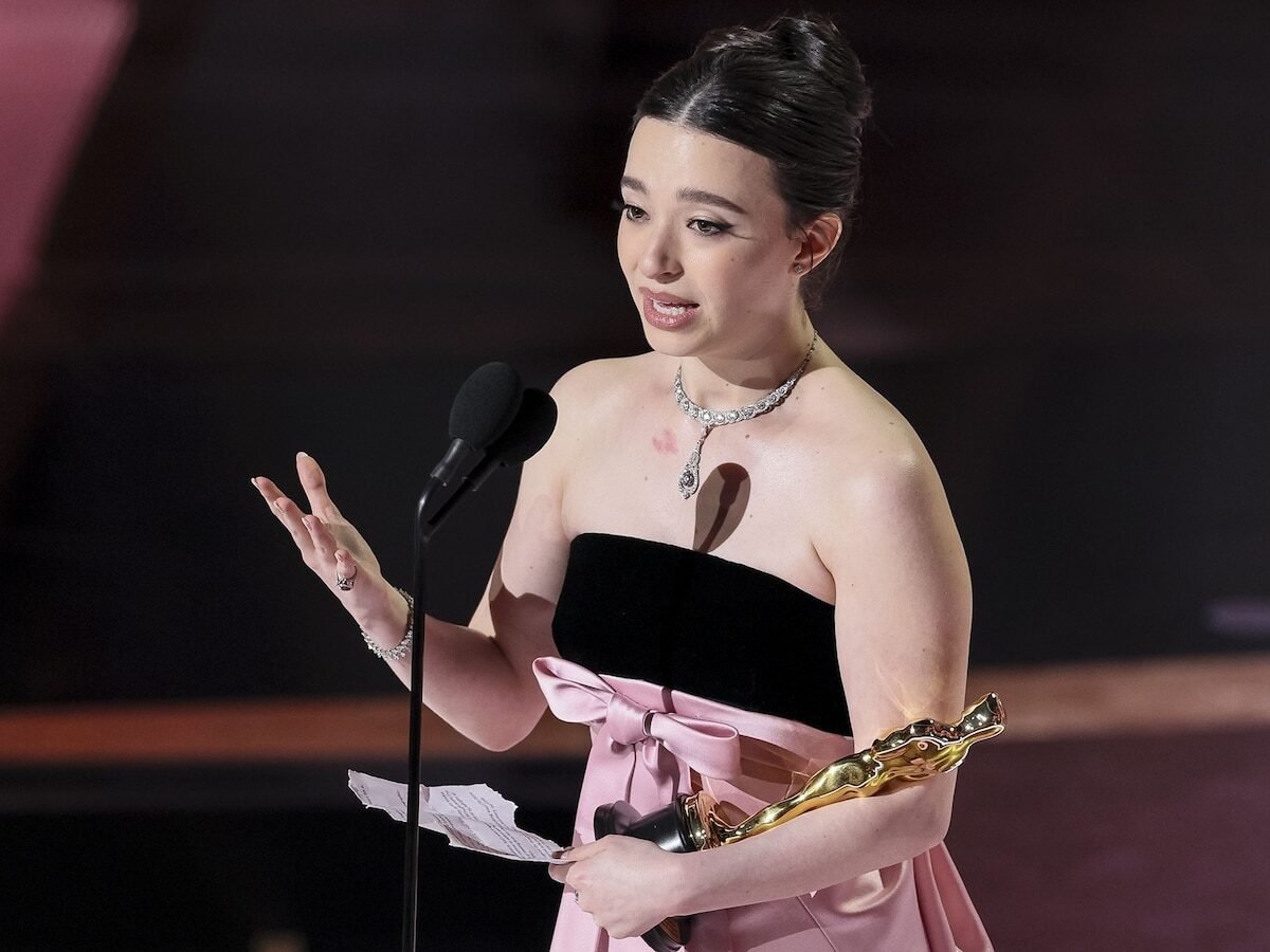Mikey Madison accepts the Oscar for Best Performance By An Actress In A Leading Role for ‘Anora’ during the 97th annual Academy Awards in Los Angeles, Mar. 2, 2025.