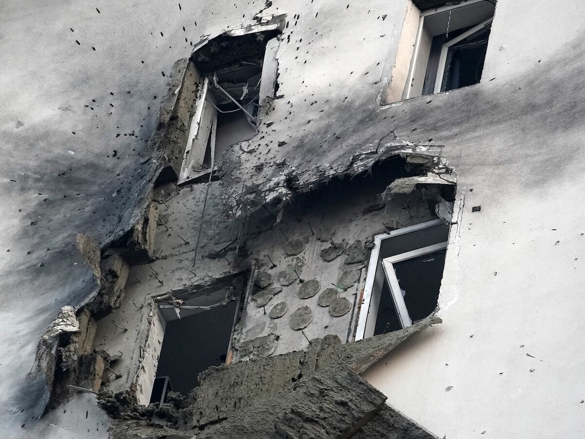 This picture shows a damaged apartment building in a residential complex following a drone attack in the village of Sapronovo in the Moscow region on March 11, 2025.