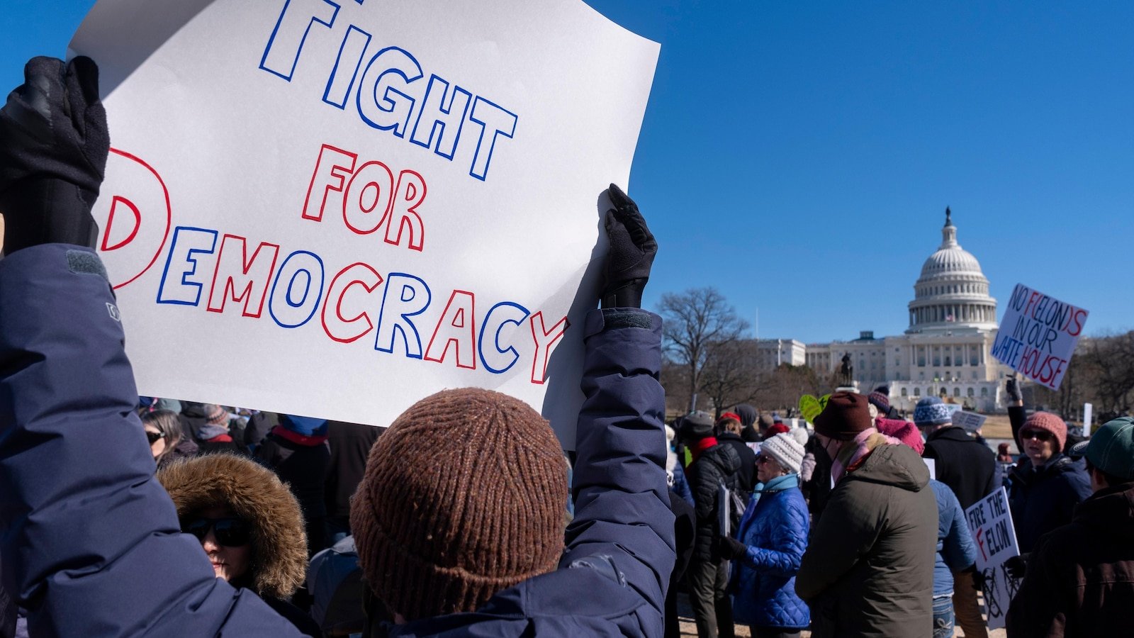 “I thought it was important to be here on Presidents Day to demonstrate for what America stands for,” said Emily Manning, 55, a Boston engineer who came to the rally with her two teenage sons. “American values are not the values of the plutocracy or the limited few rich people.”