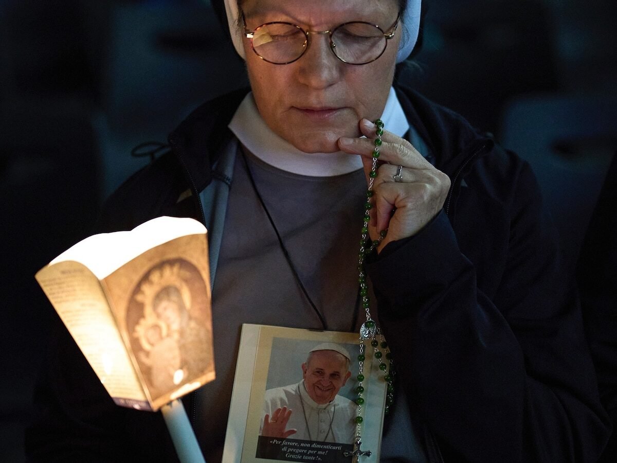 A Catholic nun holding a photograph of Pope Francis prays prior a prayer of the Rosary for Pope Francis in St. Peter’s Square at The Vatican, Saturday, March 8, 2025.