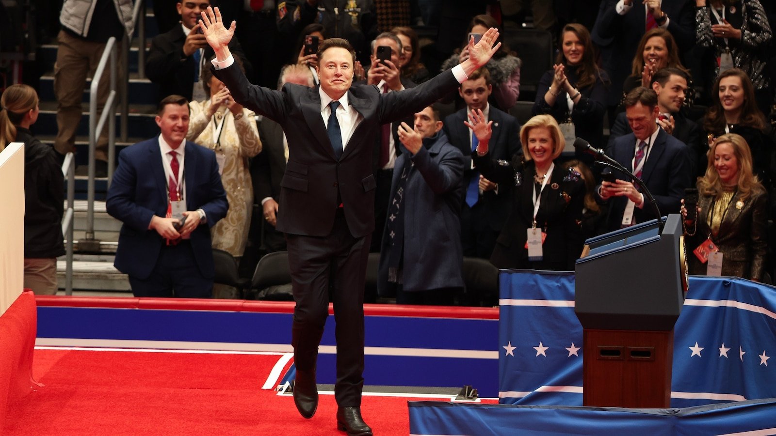 Tesla, SpaceX and X CEO Elon Musk gestures as he speaks during an inauguration event, Jan. 20, 2025 in Washington.