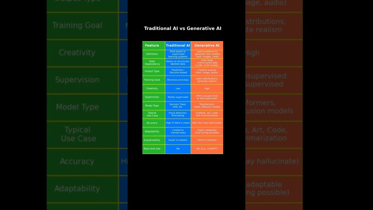 #shorts #TraditionalAI #GenerativeAI #ArtificialIntelligence #MachineLearning #AIComparison #DataScience #AIExplained #TechExplained #AIApplications #GenerativeModel #MachineLearningModels #DeepLearning #AIAnimation #TechEducation #AIVisuals