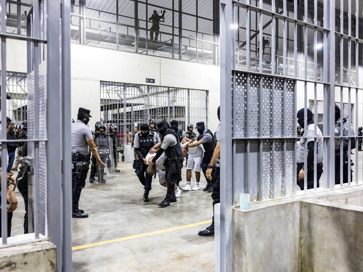 Salvadoran prison guards escort alleged members of the Venezuelan gang Tren de Aragua and the MS-13 gang recently deported by the U.S. government at the CECOT prison, in Tecoluca, El Salvador April 12, 2025.