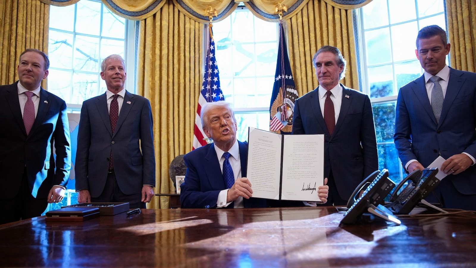 President Donald Trump signs an executive order in the Oval Office at the White House, Feb. 14, 2025 in Washington.