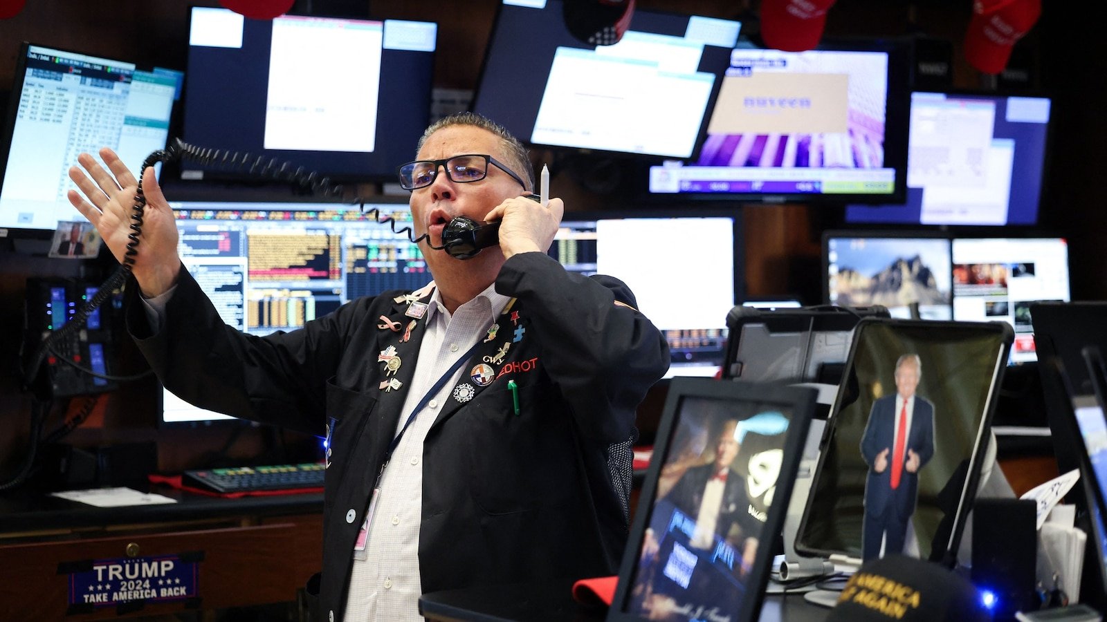 A trader talks on the phone while working on the floor of the New York Stock Exchange (NYSE) at the opening bell in New York, on April 1, 2025.