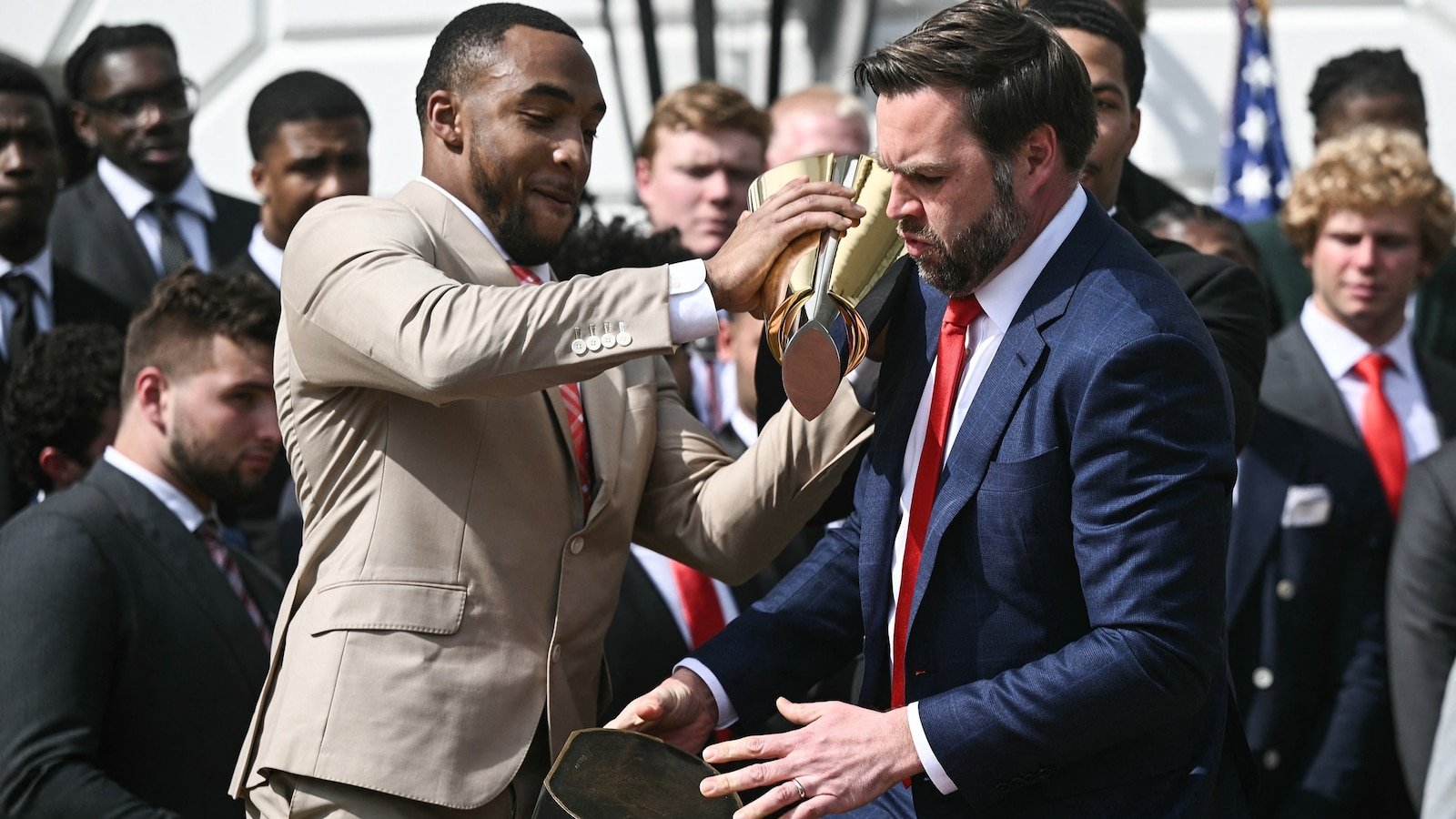 Running back TreVeyon Henderson and Vice President JD Vance bobble the College Football Playoff National Championship Trophy as President Donald Trump welcomes the 2025 College Football National Champions, the Ohio State University football team to the White House, April 14, 2025, in Washington.