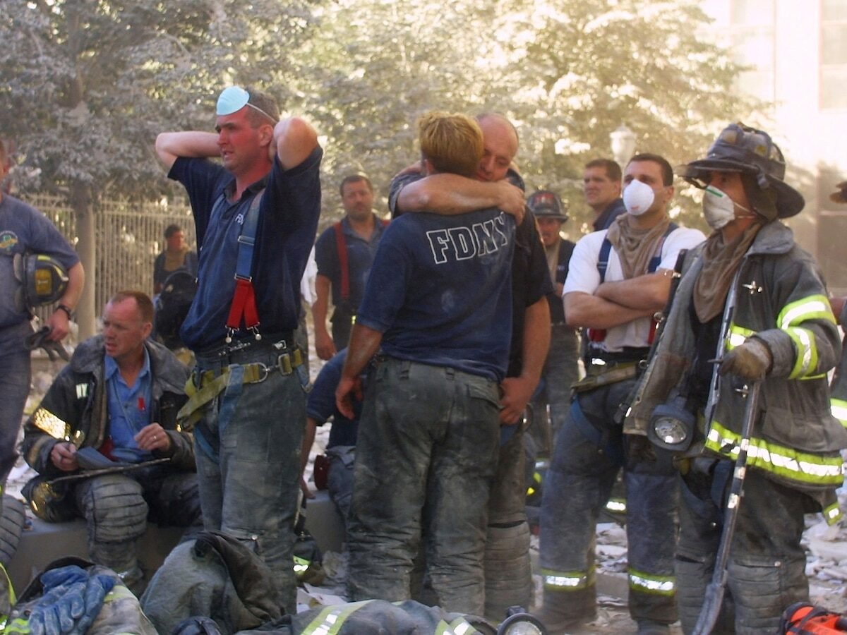 New York City firefighters hug each other during rescue operations at the World Trade Center after two hijacked planes crashed into the Twin Towers, on Sept. 11, 2001, in New York.